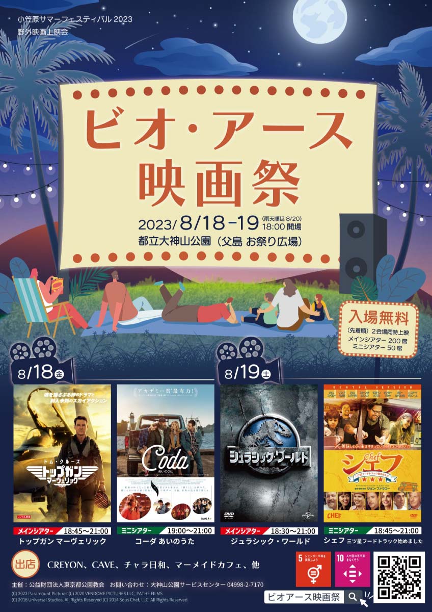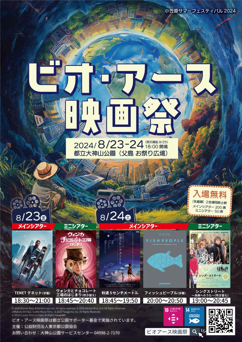 お陰様で今回6回目の開催を迎えたビオ・アース映画祭。 これまで「自然」をテーマに、この地球の自然や生き物たちの美しさや、その自然への人間社会によってもたらされた様々な脅威を紹介し、 私たちに何かできるかを考え、他者(自分以外の存在のこと)について想像する力を育んでもらいたいという想いで開催してきました。 前回(2023年8月開催)より、夏の観光シーズンに開催されるイベント「小笠原サマーフェスティバル」の一環として、 より多くの方に楽しんでいただける様に、娯楽作品も織り交ぜて開催しています。 今年も、野外で小笠原の自然を体感しながら、迫力のある大画面と音響で映画鑑賞を楽しんで頂くとともに、上映作品を通して、守るべき自然の尊さや、人や国の不平等について、 考え、想像する機会となれば幸いです。
